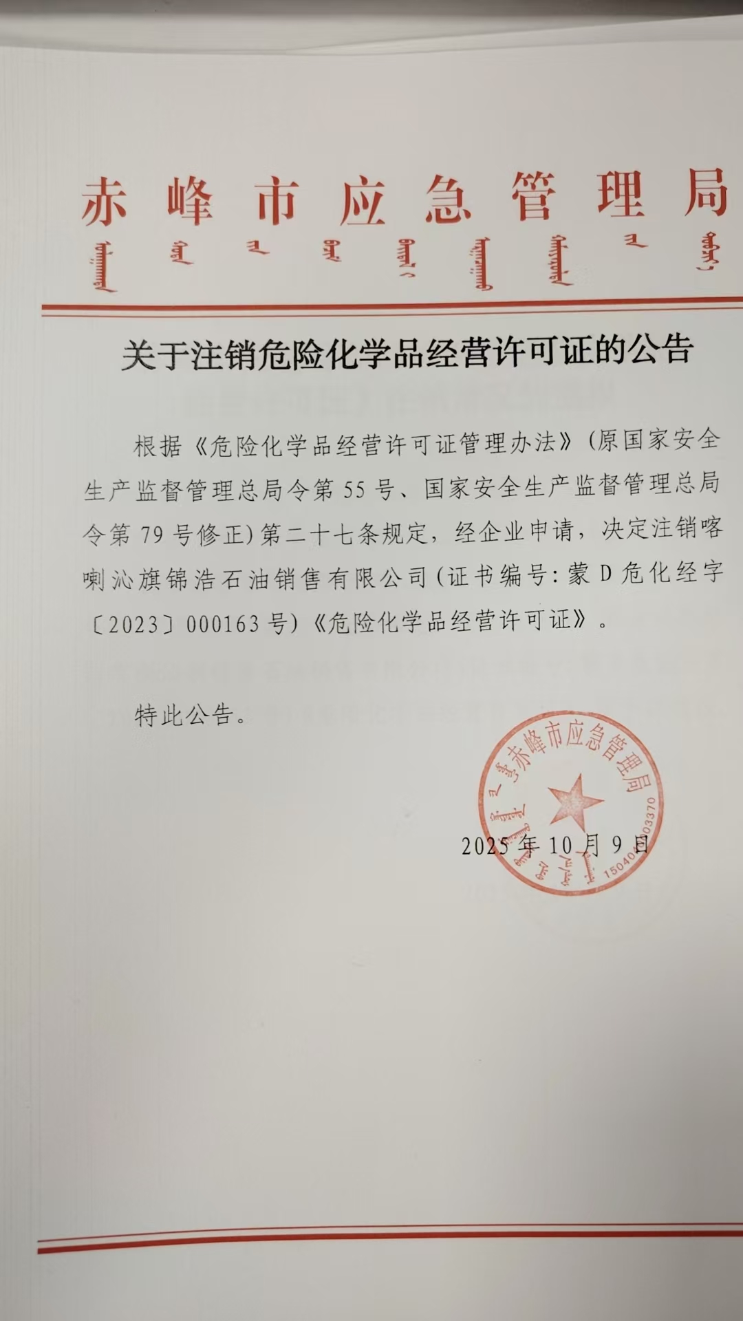 关于注销喀喇沁旗锦浩石油销售有限公司的公告