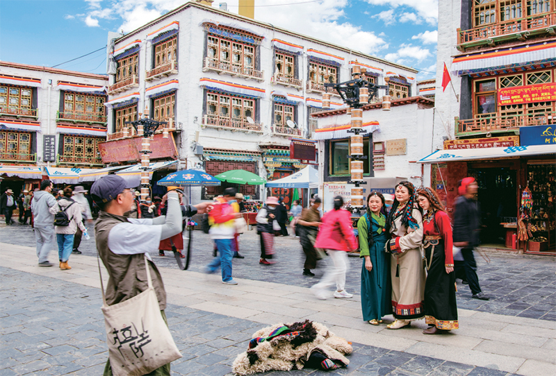 千年八廓街,见证民族团结。2021年7月,习近平总书记来到位于西藏拉萨老城区的八廓街,感慨地说:“千年八廓街,是我们各民族建起来的八廓街。各民族文化在这里交流交往交融,我们中华民族的大家庭在这里其乐融融。”图为2023年6月13日,游客身着藏装在八廓街拍照留念。