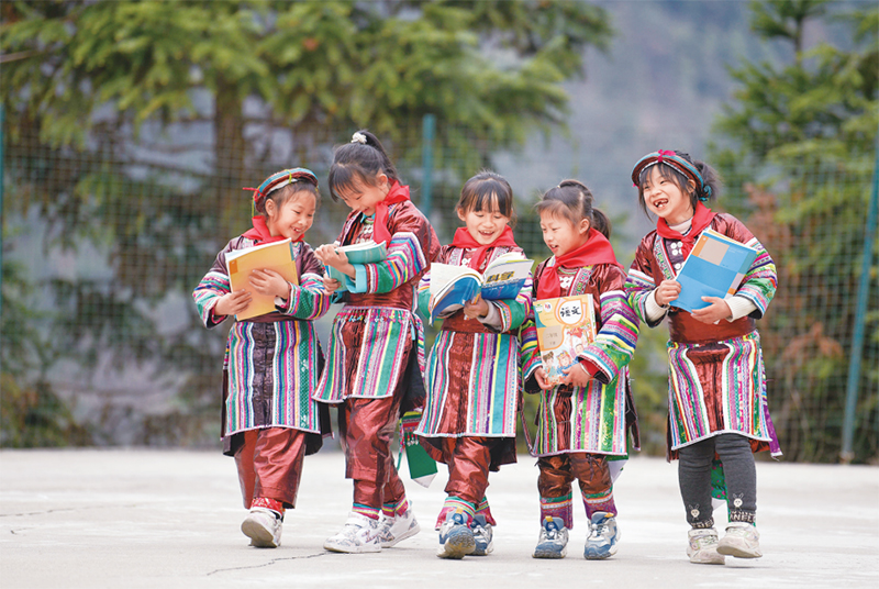 位于贵州省黔东南苗族侗族自治州从江县大山深处的西山镇中寨教学点,是一所全校均为瑶族学生的“微小学”。近年来,随着教学条件逐渐改善,学校发生了翻天覆地的变化。图为2023年2月16日,领到新书的瑶族学生在一起交流。