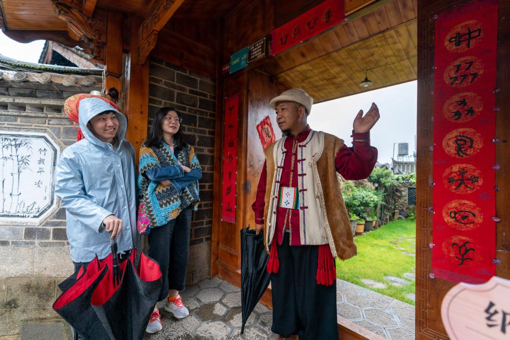云南省丽江市玉龙纳西族自治县白沙镇玉湖村村民和杰林(右)为来自北京的游客介绍纳西族东巴文(2023年8月28日摄)。