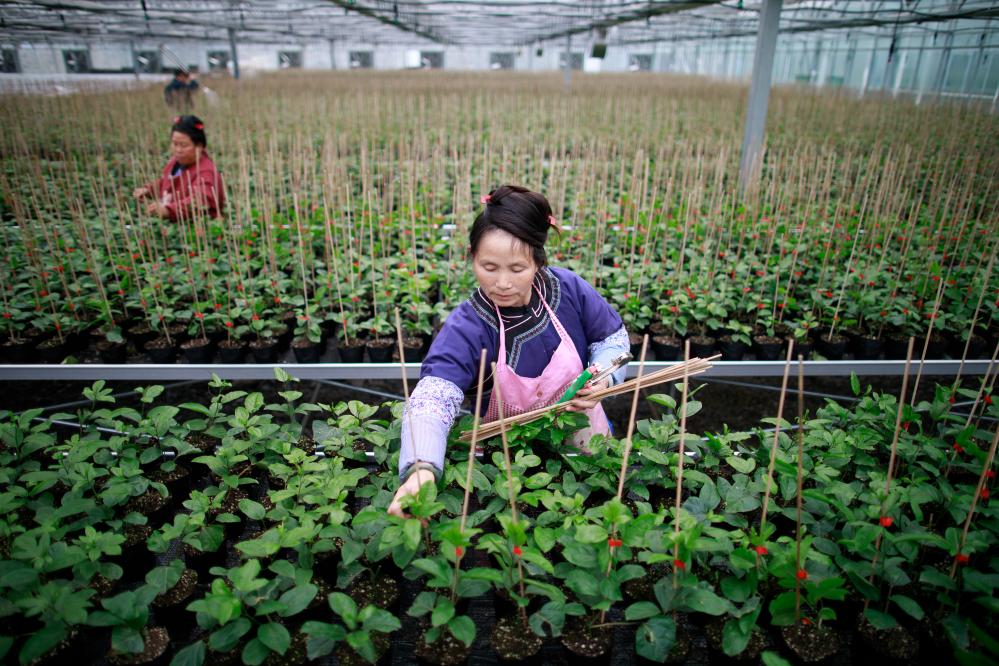在贵州省榕江县车江坝区智慧育苗中心内,一名少数民族妇女在大棚内对百香果苗进行管理(2023年2月28日摄)。