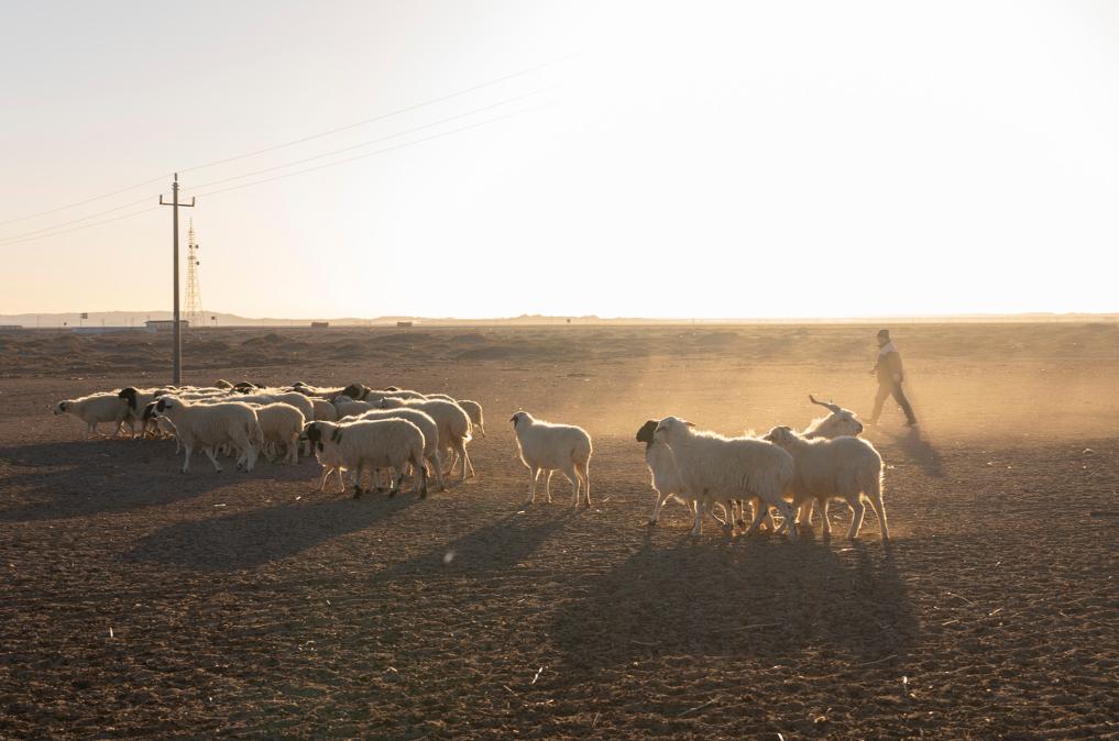 在内蒙古阿拉善左旗乌力吉苏木温都尔毛道嘎查,牧民朝勒门格尔勒在晨光中放羊(2023年11月17日摄)。
