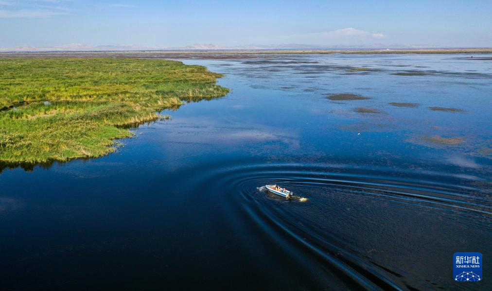 在内蒙古乌梁素海湖面上,河湖湿地水环境保护与修复技术研究团队成员乘坐快艇去采集湖水样本(2023年9月15日摄,无人机照片)。