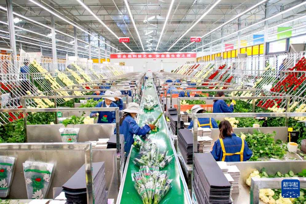 工人在甘肃临夏百益亿农国际鲜花港玫瑰工厂包装玫瑰(2023年8月15日摄)。