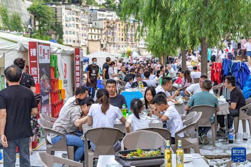 在重庆市巫溪县大宁河畔,游客和市民在品尝巫溪烤鱼(2023年6月19日摄)。