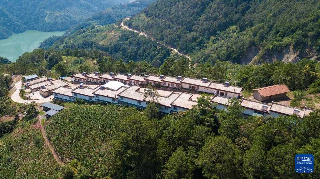 四川凉山州盐源县藤桥乡麻柳村的通村硬化路和路旁的新居(2019年8月13日摄,无人机照片)。