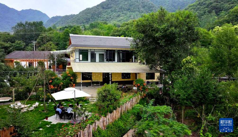 陕西省汉中市留坝县紫柏街道小留坝村的民宿(2023年7月24日摄,无人机照片)。