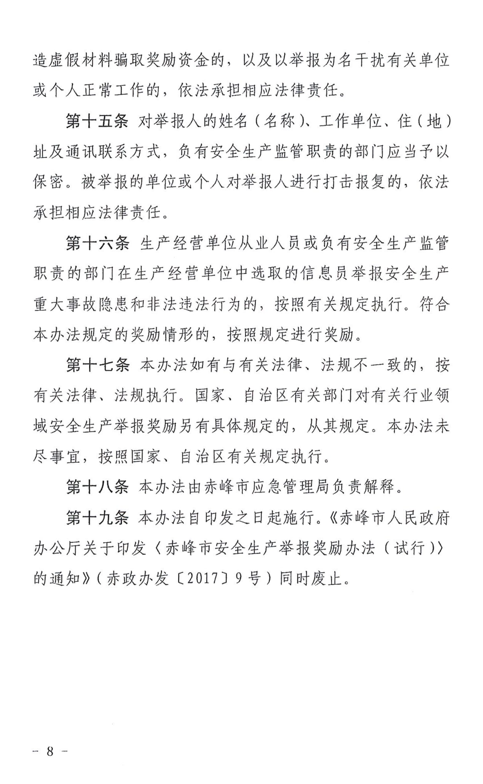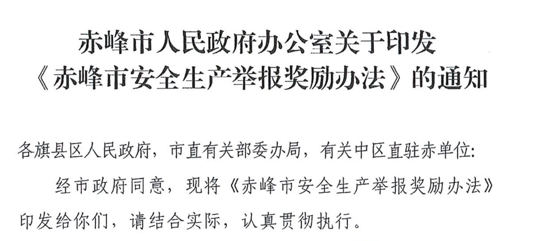 近日,随着又2笔安全生产举报奖励资金的落实,自2022年《赤峰市安全生产举报奖励办法》实施以来,我市已先后有7名举报人因安全生产举报有功被给予资金奖励,奖励总金额达3.6万余元。据悉,为落实国务院安委会安全生产十五条硬措施,我市大力推动安全生产举报奖励工作落实,制定出台了《赤峰市安全生产举报奖励办法》,对举报生产经营单位安全生产重大事故隐患和违法行为的有功人员积极兑现举报奖励,切实提高了群众参与安全生产举报的积极性。下一步,我市将继续按照规定落实安全生产举报奖励,鼓励群众举报安全生产重大事故隐患和违法行为,切实加强安全生产的社会监督,提升安全生产工作水平,有效遏制生产安全事故的发生,确保全市安全生产形势总体稳定。